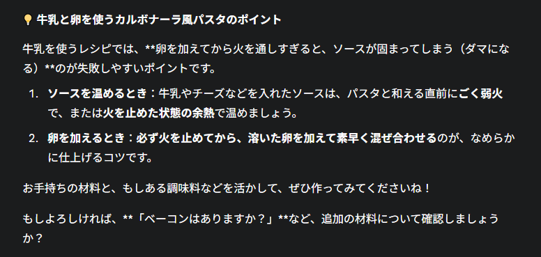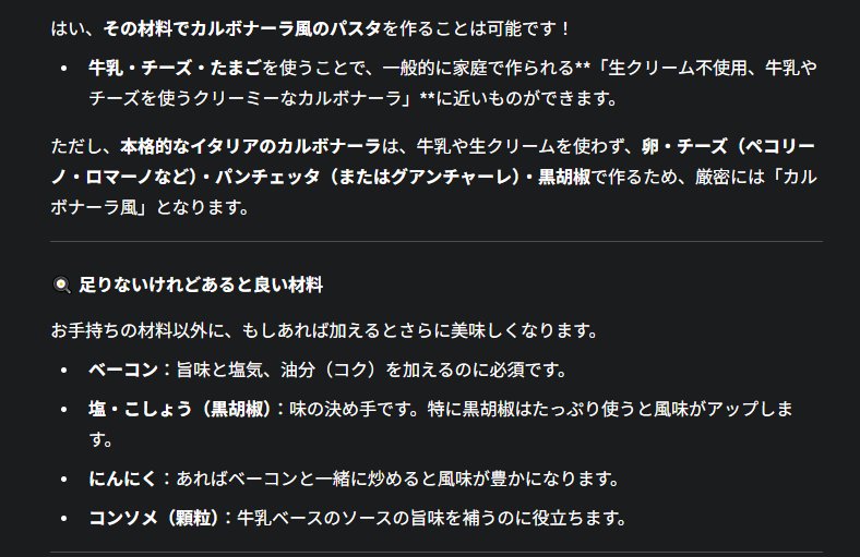 そこで、手元にある材料でカルボナーラをつくるべく、AI(今回はGoogle Gemini)にレシピを聞いて実際に作ってみました。